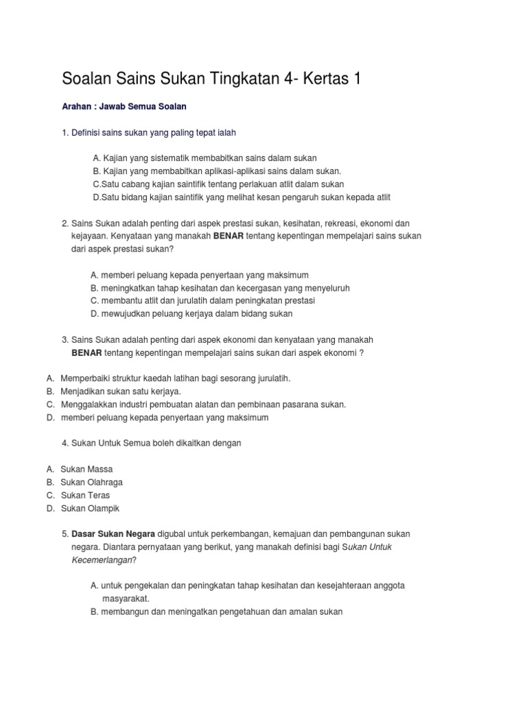 Contoh Soalan Kertas 1 Sains Sukan Tingkatan 4